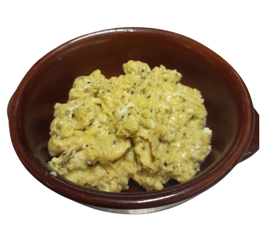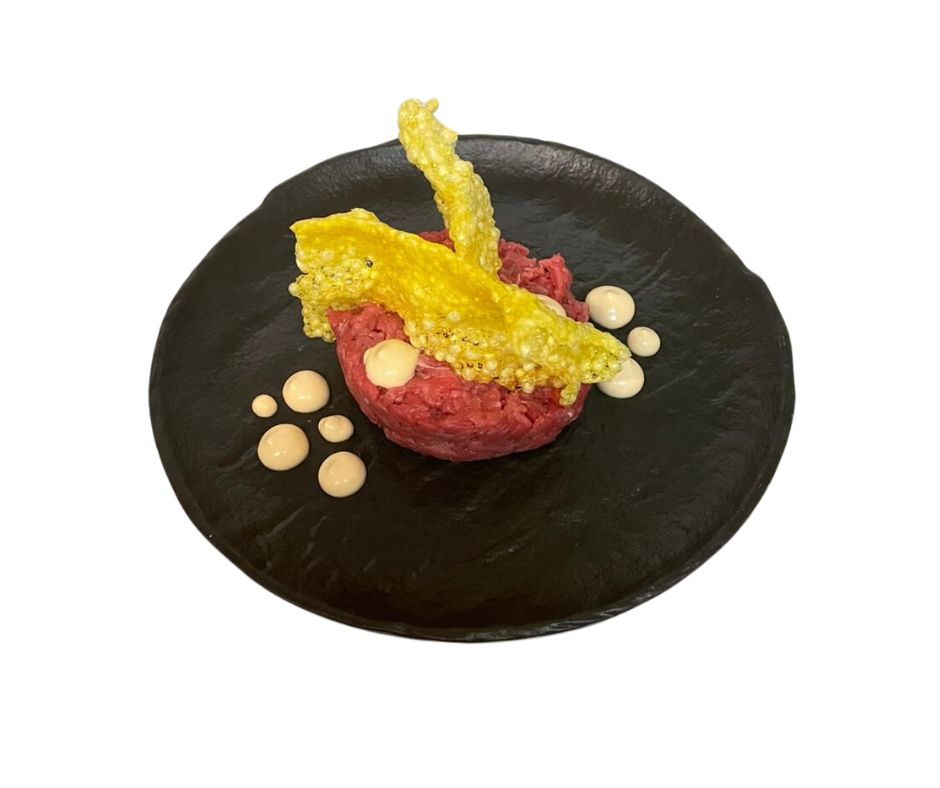 Battuta di Manzo al coltello con maionese alla soia, tapioca soffiata allo zafferano e pop-corn di maiale