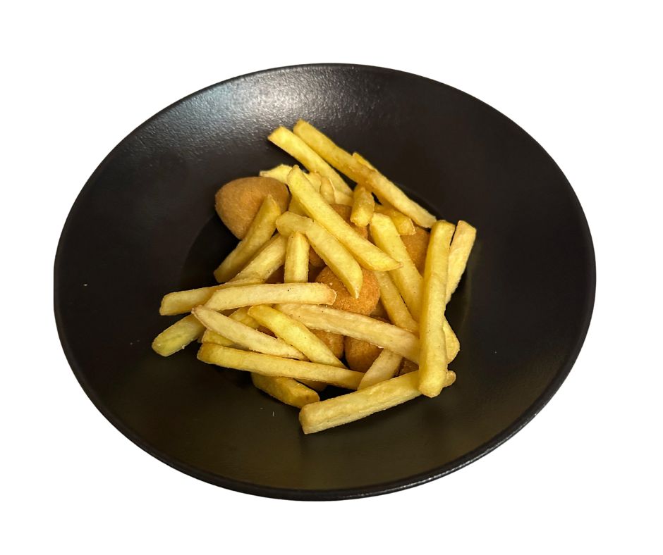 Fried green olives, stuffed with mincemeat and spices, fried potatoes, fried mozzarella balls